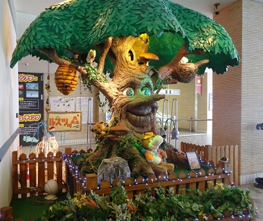 We also had Nabe. This is another shared hot pot but is more like a stew and the vegetables and meat are left in the pot until desired to eat. And we had some sashimi (raw pieces of seafood), yakitori (meat on sticks), a bottle of sake and some other bar drinks. All this came to about 2500 yen each. Bargain. Unfortunately they do not have nomihodai (all you can drink plan) so we had to stock up on booze at the convenience store before it closed at 9pm. Then it was back to the log cabin houses to party. Rusutsu Resort is such a surreal place to be and you are constantly coming across décor that leaves you thinking “what the ……?” The person that designed this hotel must have been on something very strong. There’s a singing tree by the main ski entrance, a ferris wheel, and a singing dog band with huge scary eyes to name but a few.